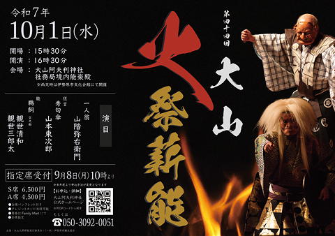大山阿夫利神社で第44回大山火祭薪能を拝見。2年前の第42回に続き2回目の参列です。今回もFacebookの丹沢関連のグループでご一緒している相模太郎さんからお誘いをいただいたもので、チケットは大山阿夫利神社下社の茶屋「さくらや」に配布された三枚の内の一枚を分けていただきました。相模太郎さん、「さくらや」さん、ありがとうございました。