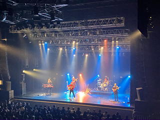しばらくの間を置いて19時半、再び客席が暗くなりSEが流される中にMoon Safariのメンバーが登場。配置は前列上手がエレクトリック・ギターのPontus Åkesson、下手がキーボードのSimon Åkesson、後列上手寄りがドラムのMikael Israelsson、その下手寄りがベースのJohan Westerlundで、Simonと共にリードボーカルを担当しアコースティックギターも弾くPetter Sandströmは最初はベーシストのすぐそばにいましたがすぐに本来の立ち位置である前列中央に出てきました。そしてよく見れば全員が赤または黒の衣装(帽子やマフラーも)を着ているばかりか、キーボード(Nord Wave2 / Nord Electro6)もエレクトリックギター(Parker Fly)もベース(Fender 5弦)も赤[1]。