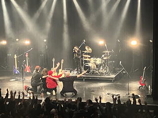 「Mega Moon」が終わったところで「Thank you!!」という声を残してメンバーは上手の袖に下がり、客席からは歓声と共に上がった拍手がアンコールを期待する手拍子に変わりました。やがてPetterとJohanがこの手拍子に応えるかたちで現れましたが、なかなか全員がステージに揃わないなと思っていたらPetterの口から「Simonの体調が悪い(illness)」ということが告げられました。これにホール内の空気が落ち込むと、すかさずJohanがビール缶を掲げて「Cheers!」。さらに聴衆に謝辞を伝えて「アリガトウゴザイマス」とやって喝采を浴びたところへSimonが現れて、Petterは「Simon the soldier!」と賞賛混じりの紹介を行いました。