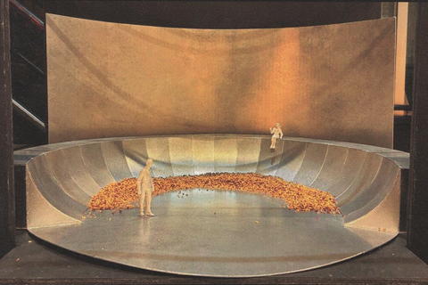 - すり鉢の上、左右から斜めに長大な布が下ろされて舞台上でクロスし、天井からぶら下がってきた大きな燭台と共にそこが屋内であることを示すのが実にうまい。観る者の想像力を刺激するこうした「見立て」は、演劇の醍醐味のひとつです。