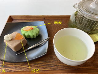鑑賞を終えた後、例によって美術館の1階にある「Cafe椿」でこの日展示された作品にちなんだ和菓子と抹茶のセットをいただきました。青山・菊家が作った和菓子の名前と絵画の対比は次のとおりです。