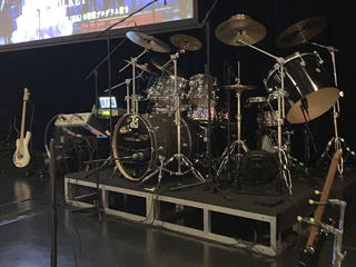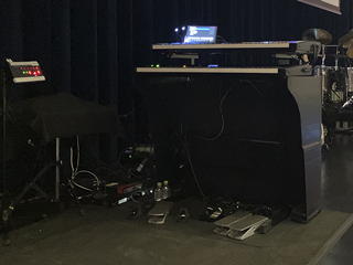 まずは機材チェック。ドラムは左手側にゴングバスとセカンドスネアを置きタムの配列もイレギュラーないつものセット。ギタリストの足元にはマルチエフェクターFM9が置かれ、ベーシストの右足側にRolandのペダルキーボード、左足側にやはりFM9、さらにこれらの間に正体不明のエフェクターらしきものがありますが、演奏中Marc Bonillaは歌のパートで頻繁にオンオフを繰り返していたので、ボーカルに対するエフェクトだったのかもしれません。ベースはレフティ仕様のStingray、そしてキーボードは例によってInfinite ResponseのMIDIコントローラーの二段重ねです。