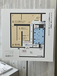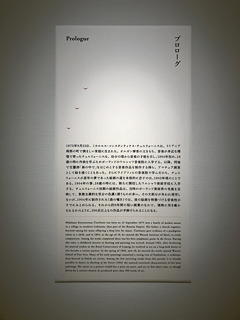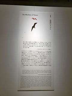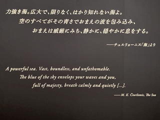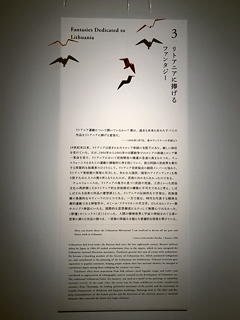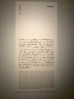 ここで各章の冒頭に掲示されていた解説を眺め直してみると、プロローグにおいて解説の上半分を占める余白部分の左下に描かれていた3羽の鳥は、章を追うごとに1羽ずつ折り紙の鳥となって飛び立っていましたが、 このエピローグでは3羽揃って遠ざかっていく様子が小さく描かれており、あたかもチュルリョーニスの魂が天に召されていく様子を示しているようでした。