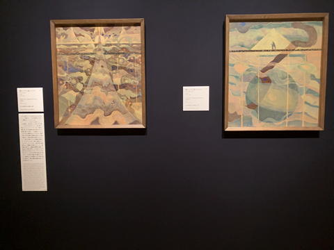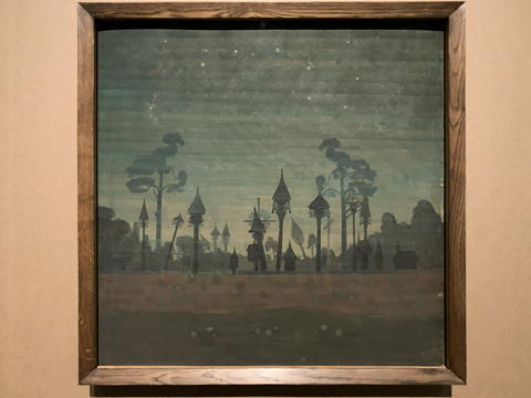 こちらは《おとぎ話(城のおとぎ話)》と《おとぎ話(王たちのおとぎ話)》(いずれも1909年)。明るく祝祭的な気分を漂わせる前者とは対照的に、後者では暗い森の中で二人の王が掌中に輝くドームに見入っていますが、ドームの中に姿を見せている村は自らの声を上げようとしているリトアニア文化そのものを表しています。