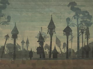 で、起伏の少ないリトアニアの谷の風景が描かれていますが、そこにはかつてライガルダスという美しい町があり、繁栄を謳歌する中で人々が神に対する敬意と謙虚さを失ったためにその怒りに触れ地中深くに沈められてしまったという伝説が残されているそうです。つまり一見牧歌的なこの絵は、今でも静かな夜には「助けて、助けて、沈んでしまう!」という悲痛な叫び声が聞こえるというこの地の失われた過去の記憶を記録したものです。