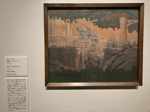 《プレリュード(騎士のプレリュード)》(1909年)も、神秘的な雰囲気を漂わせる作品です。リトアニアの首都ヴィリニュスとおぼしき都市の上空を駆け抜ける騎士(ヴィティス)のモチーフは、14世紀から18世紀末までリトアニア大公国の国章に描かれたものであり、民族の誇りの象徴ですが、この世のものならぬその透明な姿にはずいぶん昔に見た小谷元彦の《Hollow》を思い出しました。