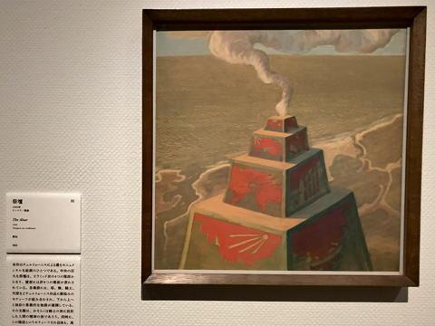 そしてこの章の最後に置かれた作品は、フライヤーの表面を飾った《祭壇》(1909年)です。モチーフの形態自体はシンプルでいながら、高い塔を上空から鳥瞰する視点の高さが独特の広がりを画面にもたらしている本作には、最後の《レックス(王)》と共に「民族解放」という枠組みを超えた普遍的な思想性が込められていると解されているため、ここでは会場における解説(部分)を引用するかたちで紹介します。