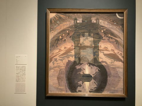 これは本当にすごい。一種メタリックな輝きを放つ地球の上に地平と空が層をなして連なり、天使たちの行列の上から太陽と三日月がそれぞれの光を投げかけ、そうした重層的な世界の全体を統べるように白い王と黒い王とが半透明の姿を表しています。この絵の前に立つと、最初のうちは何が描かれているのか理解できずに困惑するのですが、じっと目を凝らしているうちに王たちの姿やその背後の宇宙の様相が見えてきて、やがて画面の中に吸い込まれていきそうになりました。この展覧会の中でも別格の存在、まさに「王」だと言ってよい作品です。
